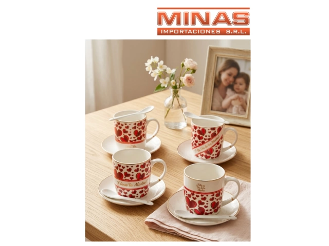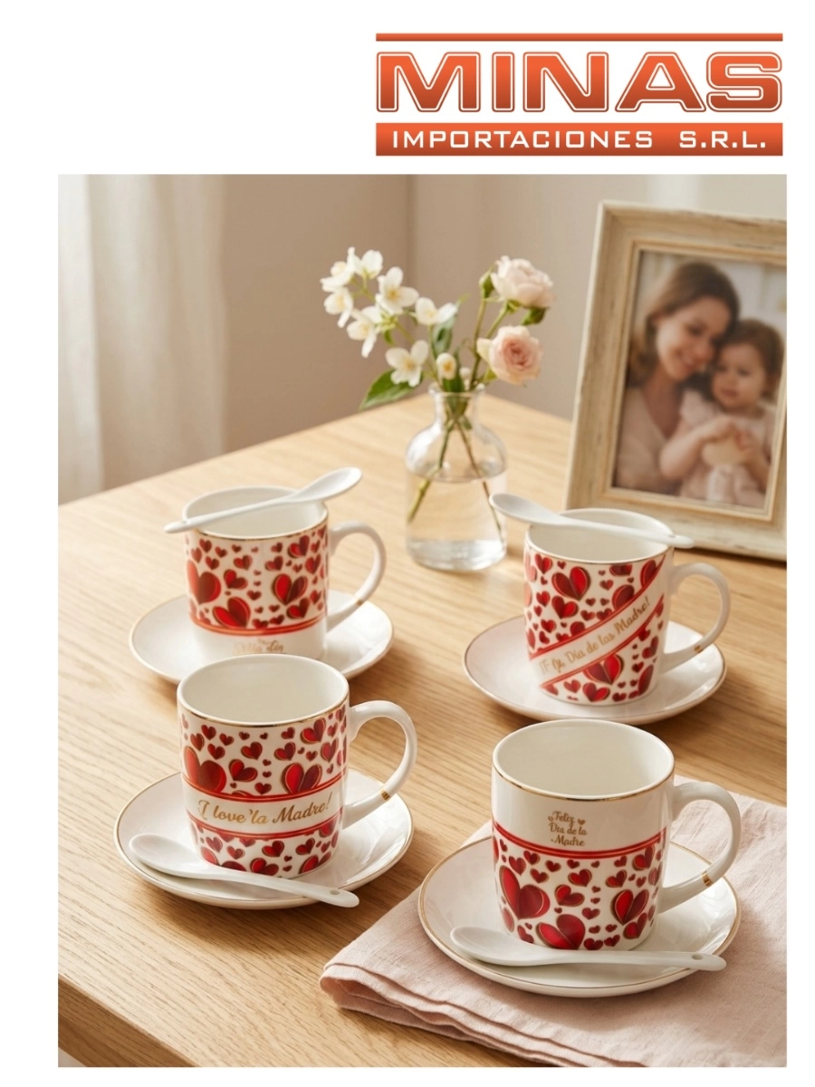 TAZA + PLATO + CUCHARA, FELIZ DIA MAMA, 4 MODELOS.