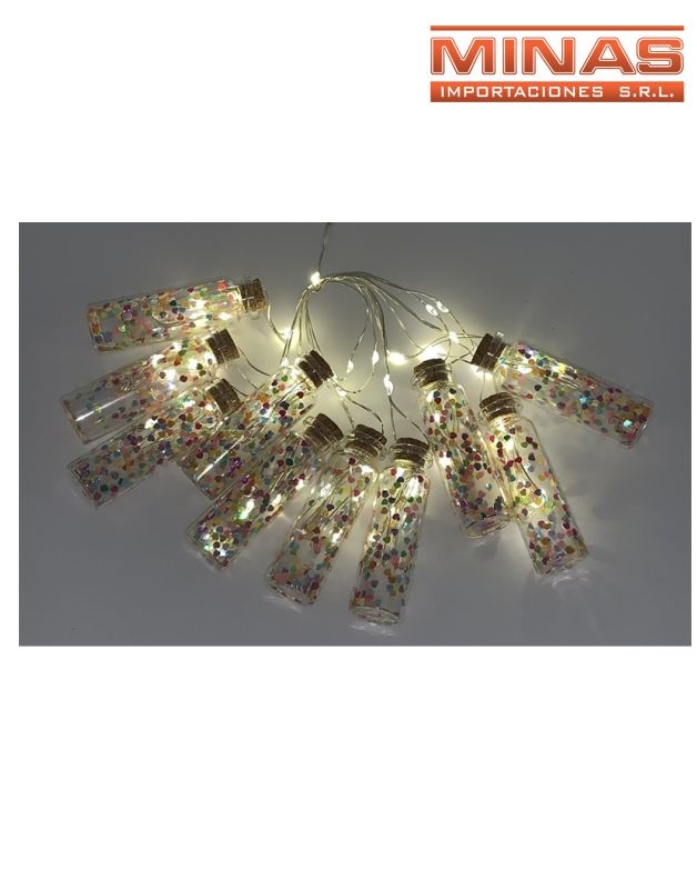 Guirnalda led de 10 botellitas, a pila, con gliter multicolor. Código SKU MI5952 Cajón cerrado por 100 unidades