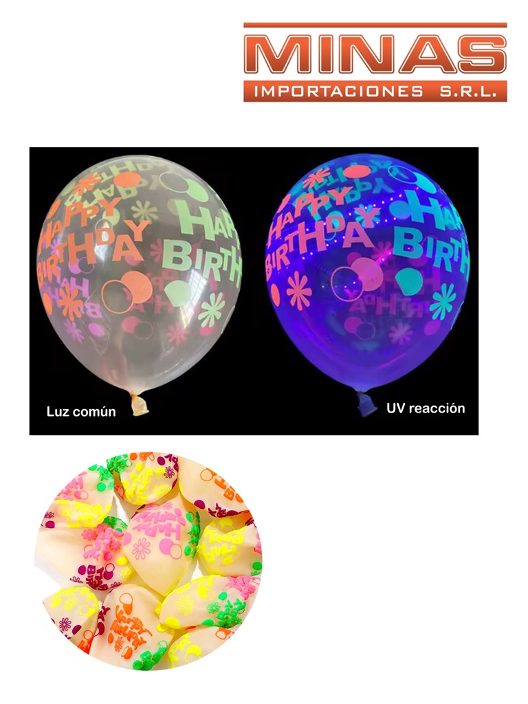 Globos fluor neon.x 10 und,¨happy birthday¨, brillan con luz uv. Código SKU MN234 Cajón cerrado por 600 unidades