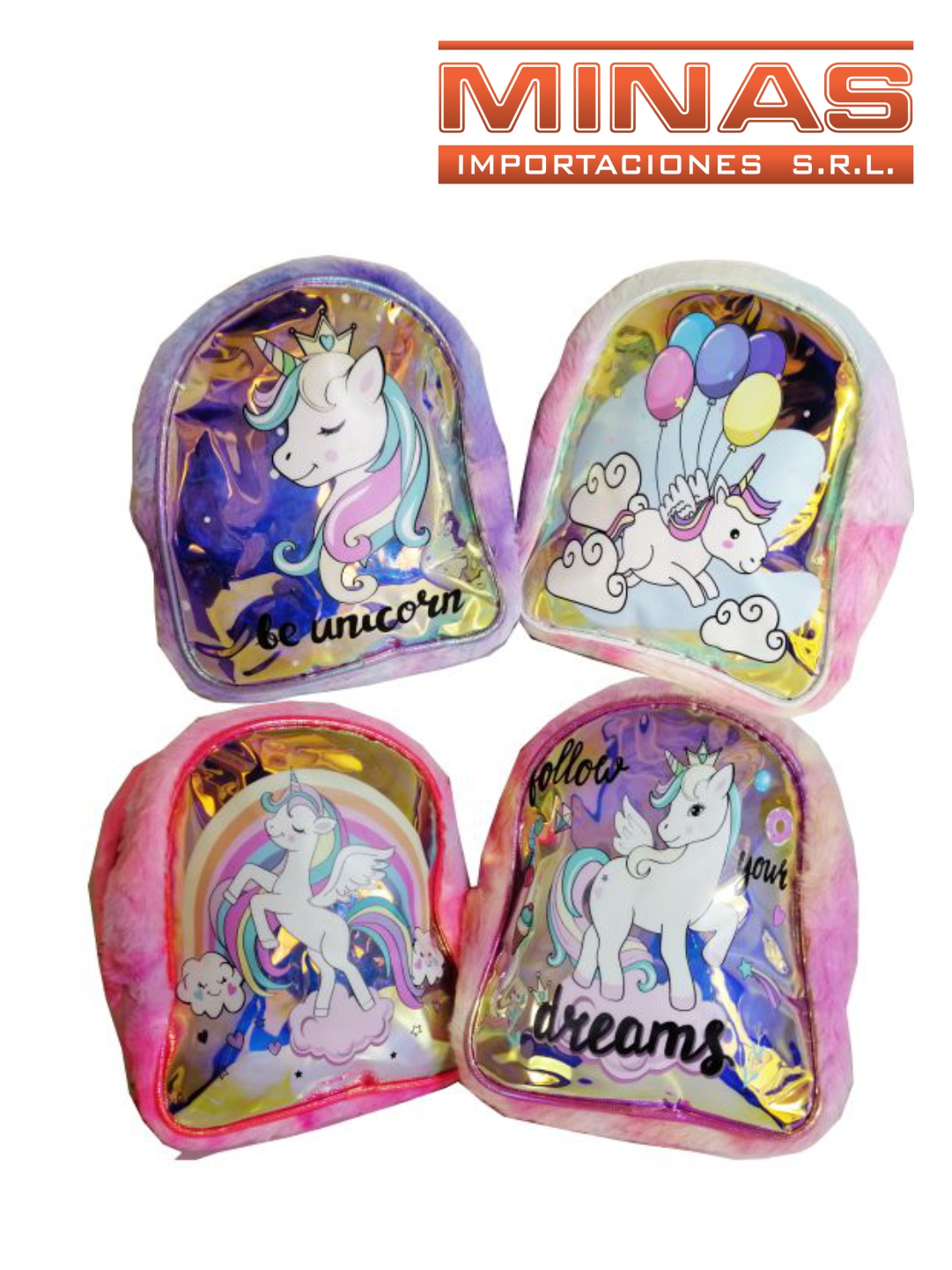 MOCHILITA PELUCHE DE 25 CM X 22 CM ,UNICORNIO,4 DISEÑOS.