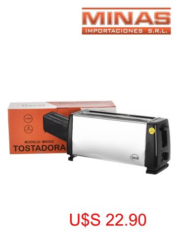 Tostadora para 4 rebanadas, 1400 w, 6 niveles de tostado, ac. inoxidable con negro. Código SKU MN352 Cajón cerrado por 12 unidades