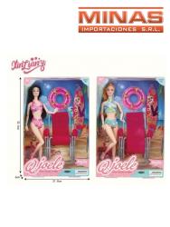 Muñeca bañista, articulada de 30 cm + 3 accesorios para la playa.